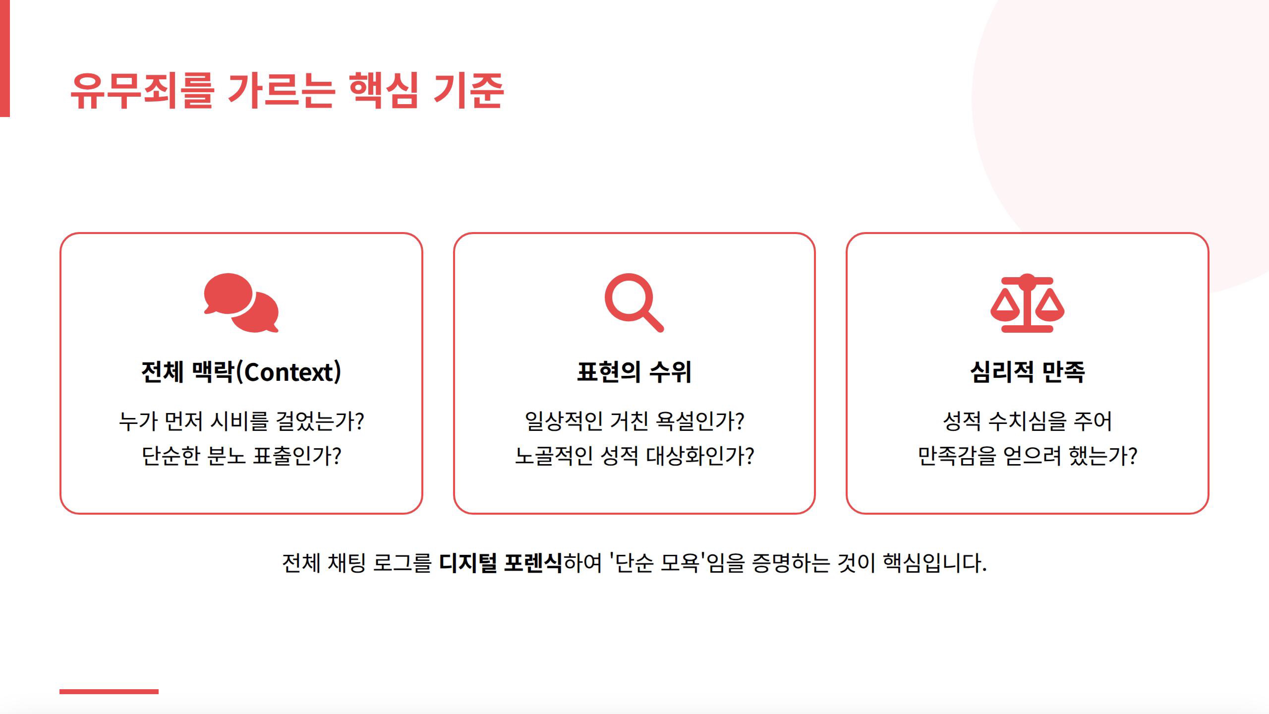 · 피의자의 경우: 상대방이 고의로 자신을 도발하여 성적인 욕설을 유도한 뒤 합의금(소위 '헌터')을 뜯어내려는 기획 고소인지 살펴봐야 합니다. 경찰 연락을 받고 당황하여 "미안하다"며 섣부른 사과를 하거나 무조건 부인하기 전에, 당시의 전체 로그를 확보하여 해당 발언이 '성적 목적'이 결여된 단순 욕설임을 입증할 형사법적 의견서를 신속히 수사기관에 제출해야 억울한 낙인을 피할 수 있습니다. |