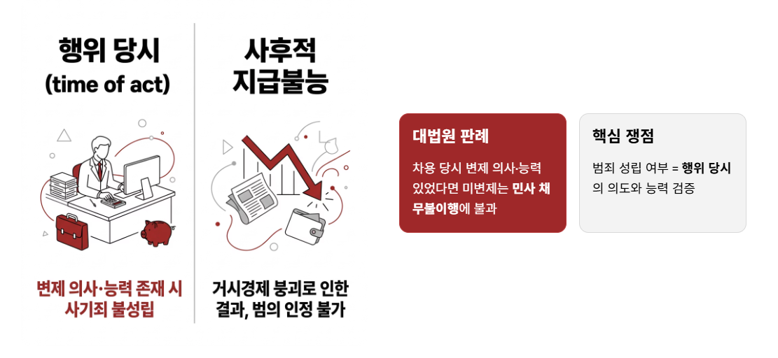 그러나 대법원 판례는 "사기죄의 주관적 구성요건인 편취의 범의는 피고인이 자백하지 않는 이상 범행 전후의 피고인의 재력, 환경, 범행의 내용, 거래의 이행과정 등과 같은 객관적인 사정 등을 종합하여 판단하여야 하고, 차용 당시에는 변제할 의사와 능력이 있었다면 그 후에 차용금을 변제하지 못하게 되었다고 하더라도 이는 단순한 민사상의 채무불이행에 불과할 뿐 형사상 사기죄가 성립한다고 할 수 없다"고 명확히 판시한 판결례를 형성하고 있지만, 반대로 편취 범의의 미필적 고의를 광범위하게 인정한 판결례도 갖고 있습니다. 이를 해결하기 위해서 어떠한 패턴의 법리적 적용을 받게 되는지에 따라 그 결론은 크게 달라지게 됩니다.