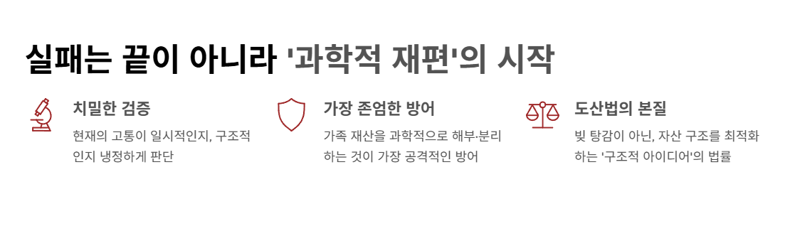 지금 겪는 매출 부진이나 소득 감소가 일시적인 비바람인지, 아니면 거대한 지각변동인지 냉정하게 판단해야 합니다. 만약 후자라면, 배우자의 자산까지 늪에 빠지기 전에 전략적 디레버리징(Strategic Deleveraging)을 단행해야 합니다. 가족의 재산을 '과학적으로 해부'하여 명확히 분리해내는 것이야말로 가장 공격적인 방어입니다.