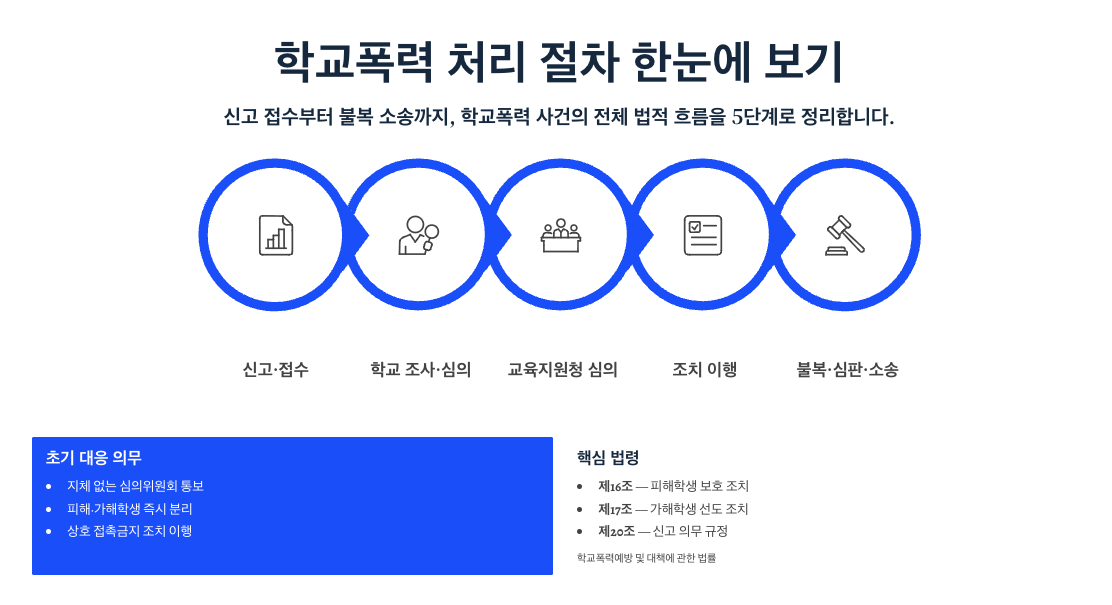 실무 흐름도 이 “신고 → 학교 조사 → 전담기구 심의 → 심의위원회 개최 요청” 형태로 진행되는 사례도 확인됩니다. (대전지방법원 2024. 7. 24. 선고 2023구합203510 판결 참고)