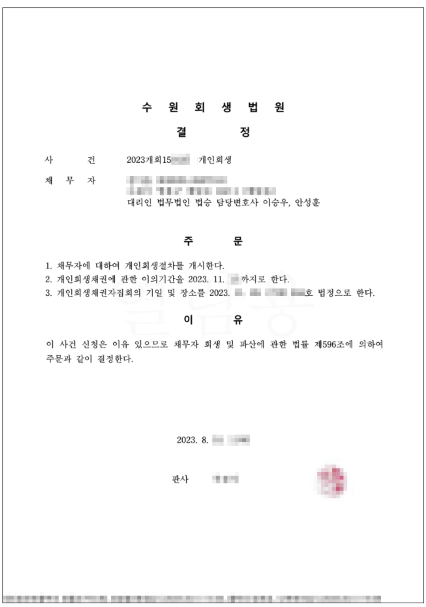 의뢰인은 30대의 여성으로, 수원에서 급여소득자로 일하고 있습니다. 의뢰인은 두 명의 미성년자 자녀가 있고 배우자는 공장에서 일하고 있습니다. 반도체 경기가 나빠지며 회사 수입이 급격하게 줄어들자 임금이 밀리기 시작하였고. 대출금과 카드 돌려막기로 생활하던 중, 연체가 시작되자 급하게 일자리를 구하였습니다. 이후에도 급여가 적어, 생활비에도 벅차 빚을 갚을 수 없는 상황에 놓이게 되었습니다. 이러한 상황을 더 이상 감당할 수 없다고 판단하고 법무법인 법승 회생팀에 사건을 의뢰하였습니다.