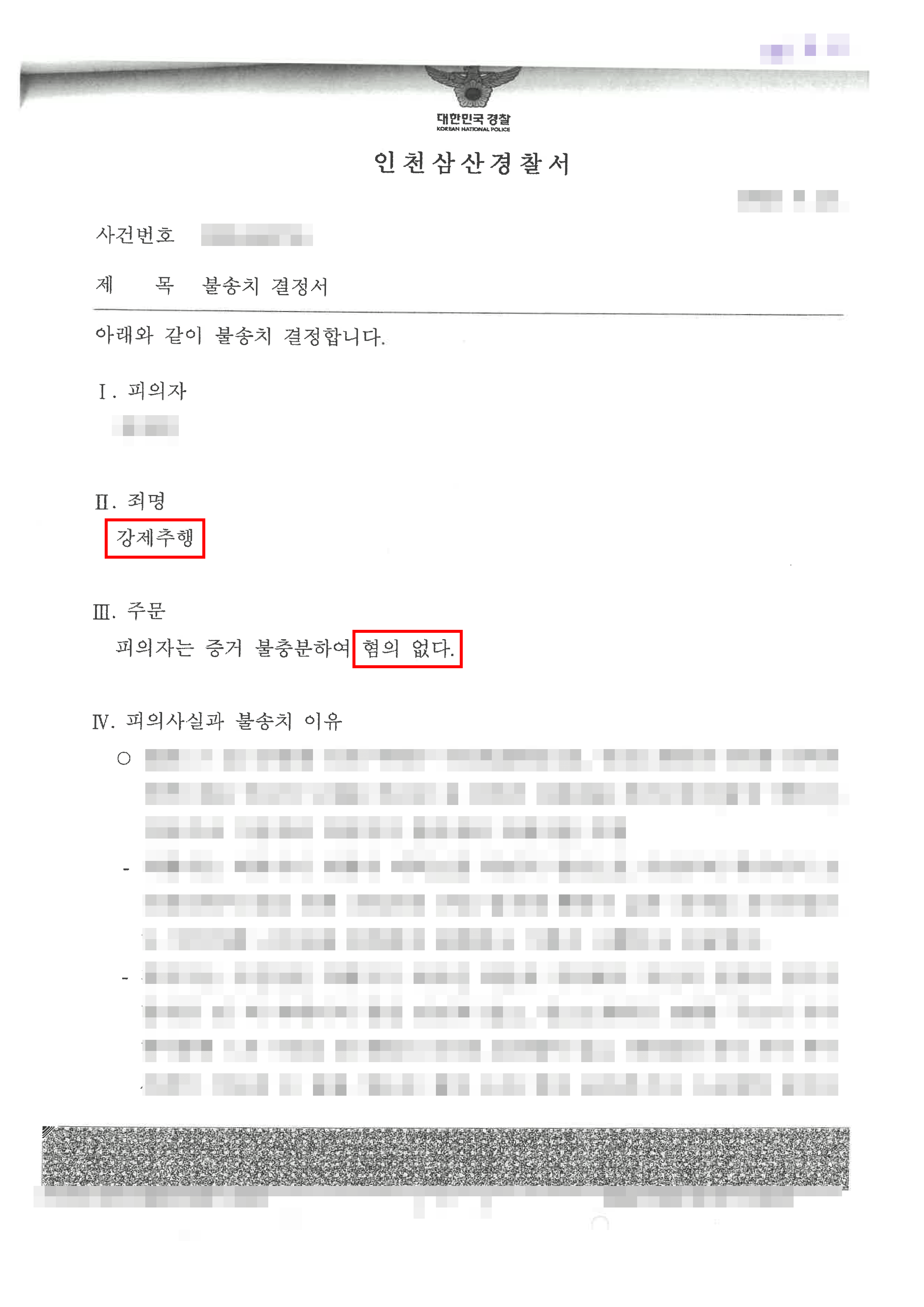 결국 경찰은 의뢰인에 대해 '증거 불충분하여 혐의없음'으로 불송치 결정을 내렸습니다.