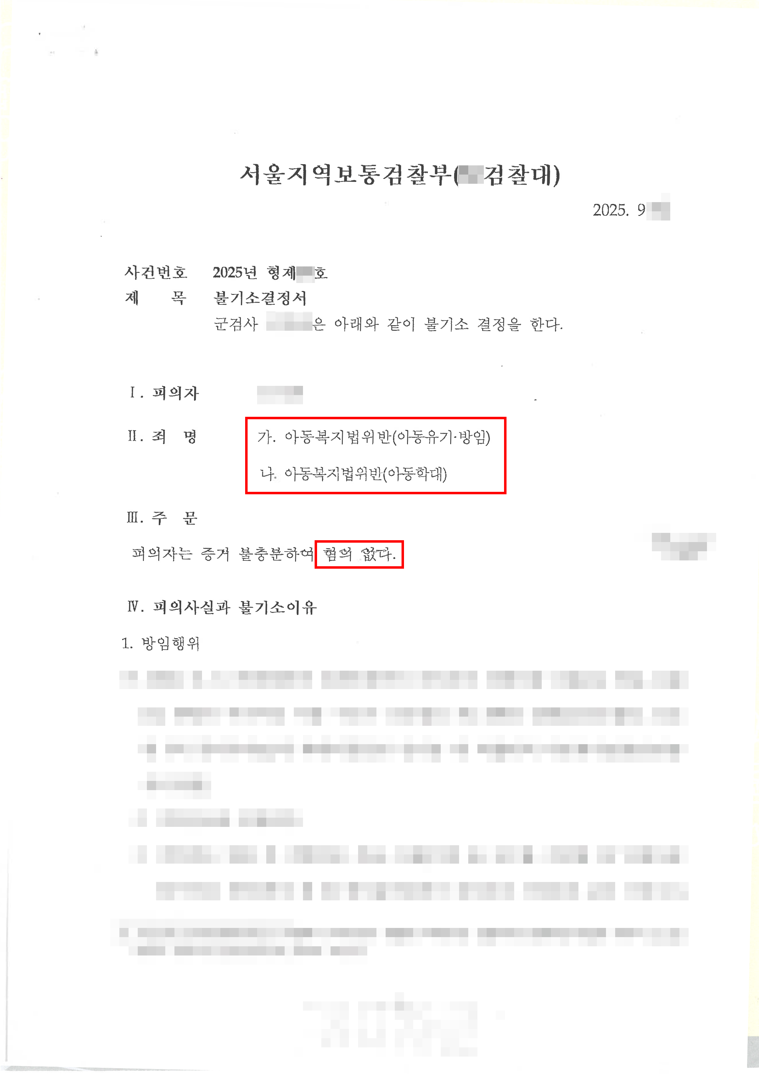 서울지역보통검찰부는 의뢰인에게 적용된 아동복지법위반(아동유기·방임) 및 아동복지법위반(아동학대)의 모든 혐의에 대해 증거 불충분하여 혐의 없음을 결정하고 불기소 처리하였습니다.