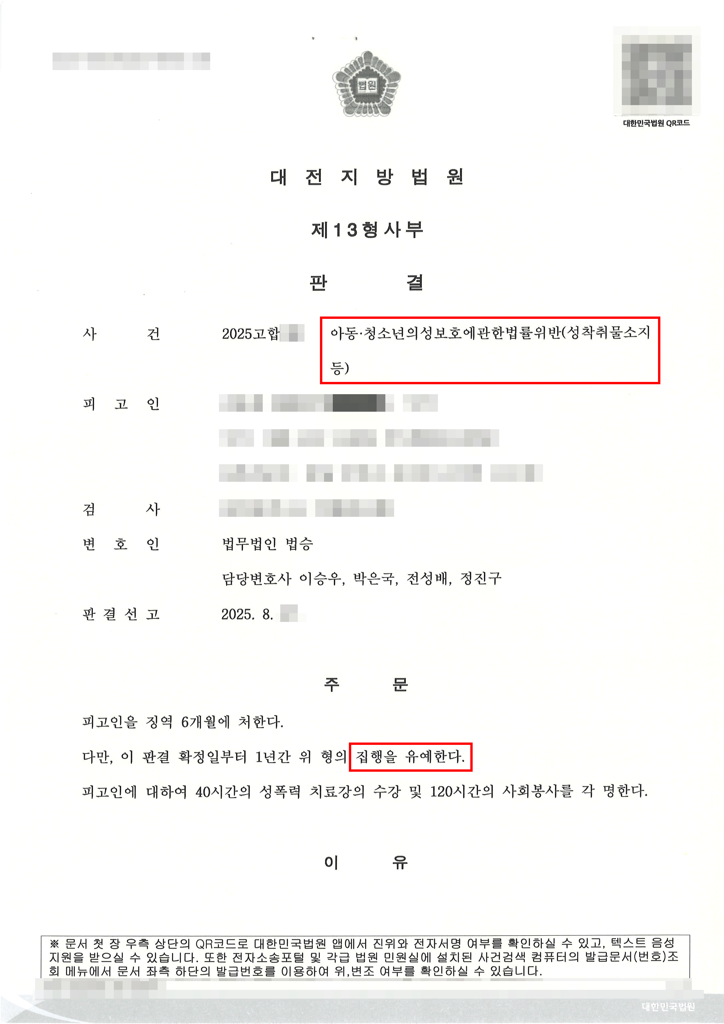 아동·청소년 성착취물 관련 사건은 사회적으로 중대하고 처벌 수위가 매우 높습니다. 그러나 이번 사건은 법무법인 법승 대전사무소 형사전문변호사의 조력을 통해 피고인이 이 사건 범죄에 이르게된 경위와 진심으로 반성의 태도를 진실되게 소명하고, 재범의 위험성이 없다는 점을 적극적으로 입증함으로써 실형을 면하고 집행유예라는 실질적 선처를 얻은 사례입니다.