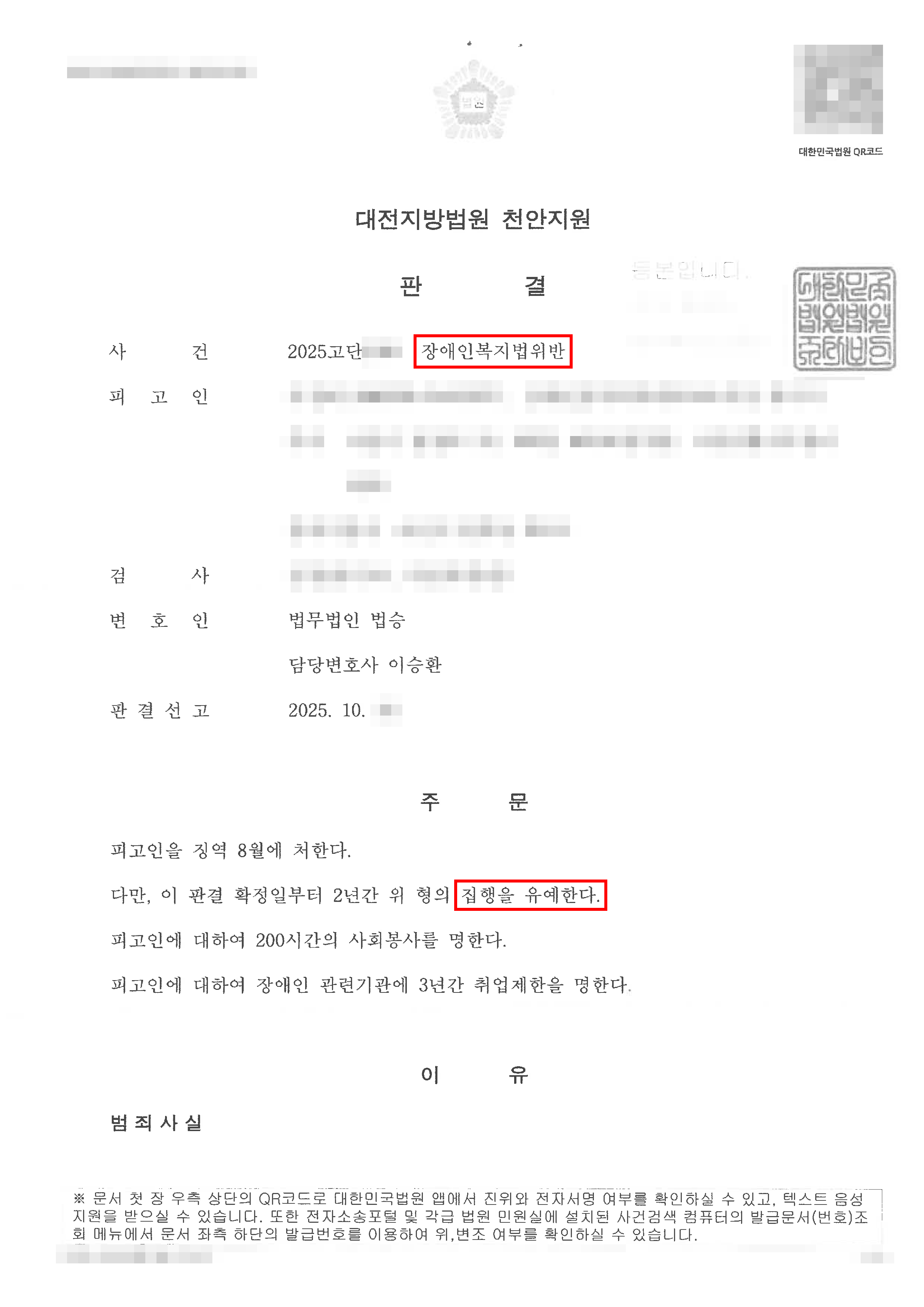 본 사건은 장애인 학대 신고 의무자가 지적장애인들에게 다수의 학대 행위를 저지른 중대한 사안이었기에 실형 선고의 가능성이 매우 높았습니다. 그러나 변론팀은 피고인의 진지한 반성 태도를 일관되게 보여주고, 피해자와의 합의, 공탁 등 실질적인 피해 회복 노력을 재판부에 적극적으로 소명했습니다. 특히 중증 장애인 학대 사건임에도 불구하고 초범인 점과 양형자료들을 통해 집행유예 판결을 이끌어내어 의뢰인이 구금되는 최악의 상황을 방지할 수 있었습니다.