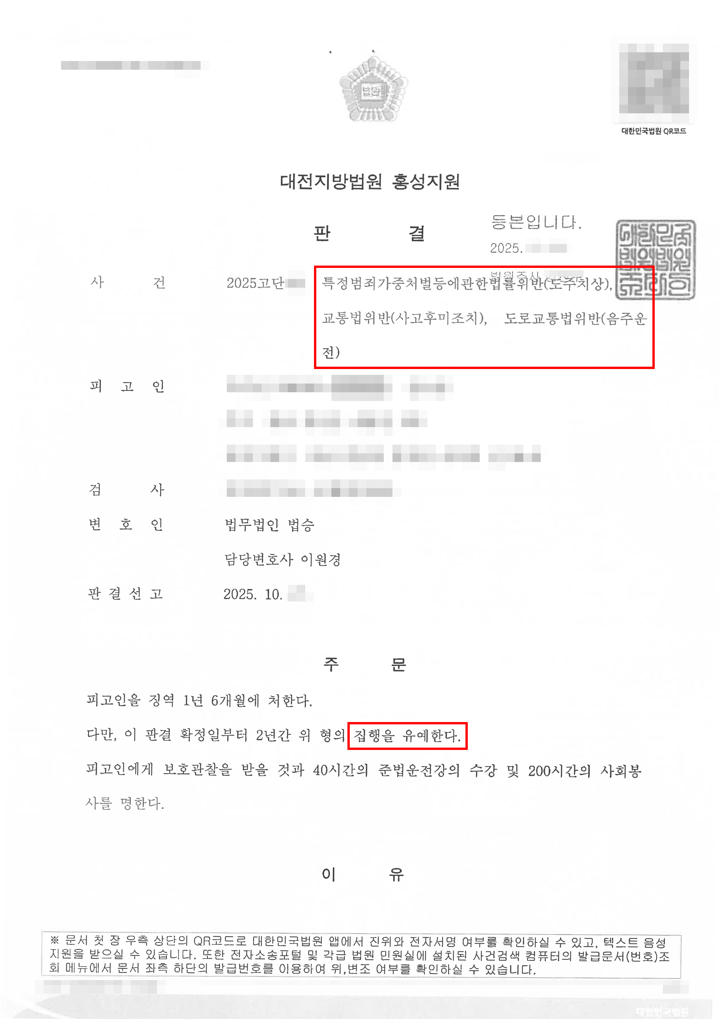대전지방법원 홍성지원은 의뢰인이 동종의 처벌 전력 및 피해자로부터 용서받지 못한 점을 불리한 정상이라고 판단하면서도, 의뢰인이 자동차종합보험에 가입되어 있었고 반성하며 피해자를 위해 공탁한 점을 유리한 정상으로 판단하여 징역 1년 6월 및 집행유예 2년을 선고하였습니다.
