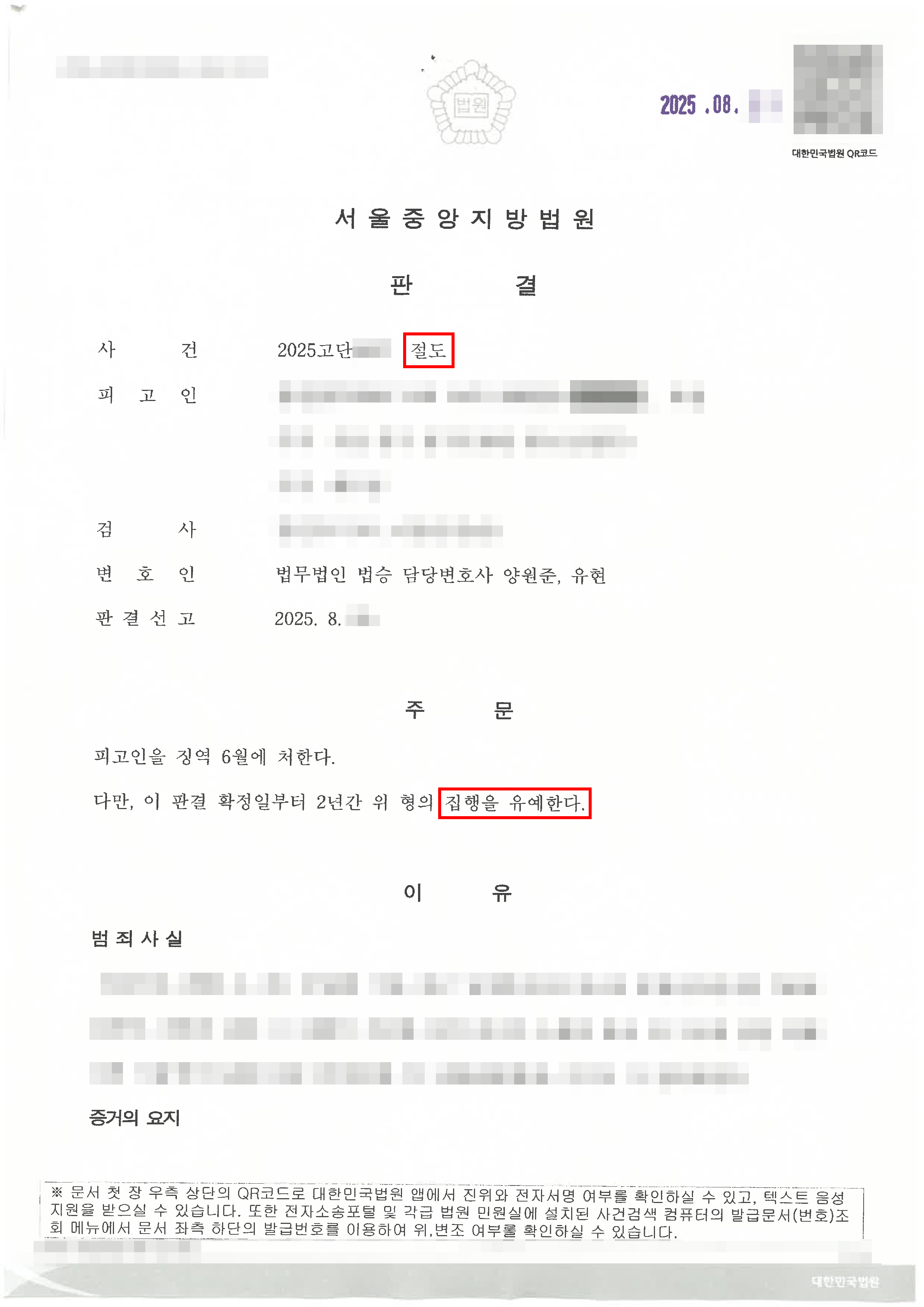 법원은 의뢰인의 전과에도 불구하고 깊이 반성하는 태도와 전후 사정을 고려하여, 징역 6월에 집행유예 2년을 선고하였습니다.