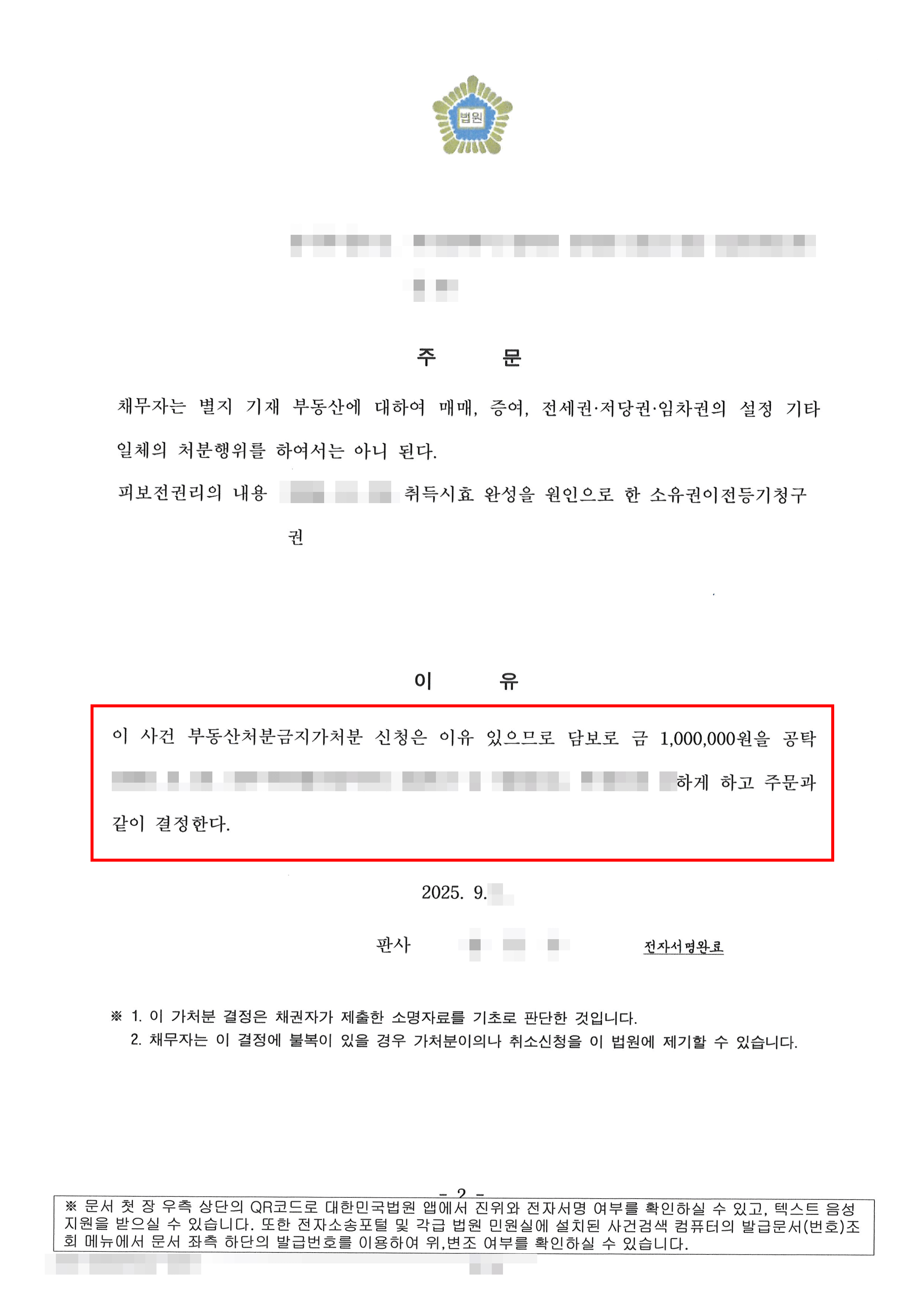 법원은 신청을 받아들여 해당 부동산에 대한 처분금지가처분 결정을 인용하였습니다.