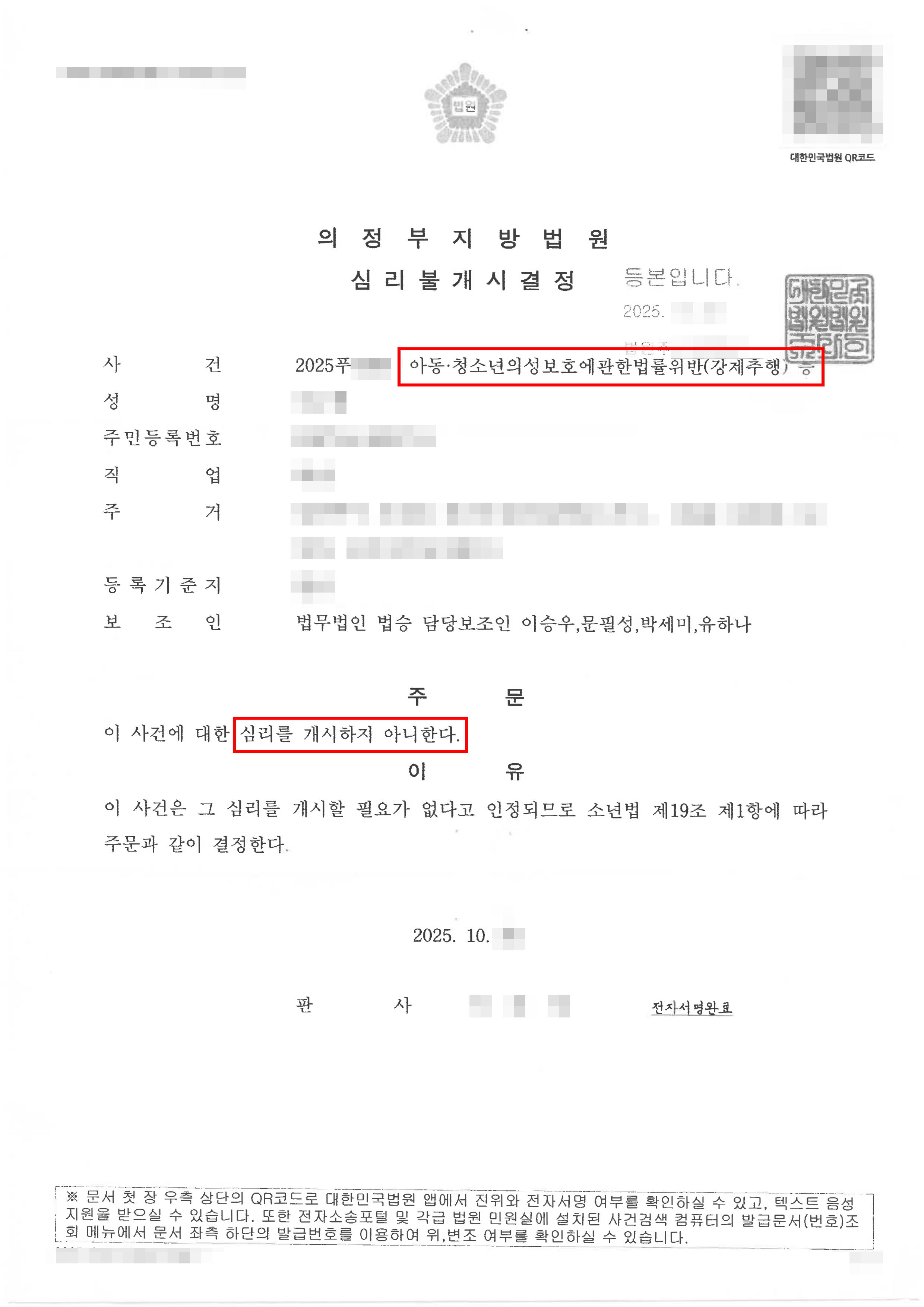 남양주성범죄변호사의 요청이 받아들여저, 재판부에서는 의뢰인 자녀에 대한 심리불개시결정을 내렸습니다.