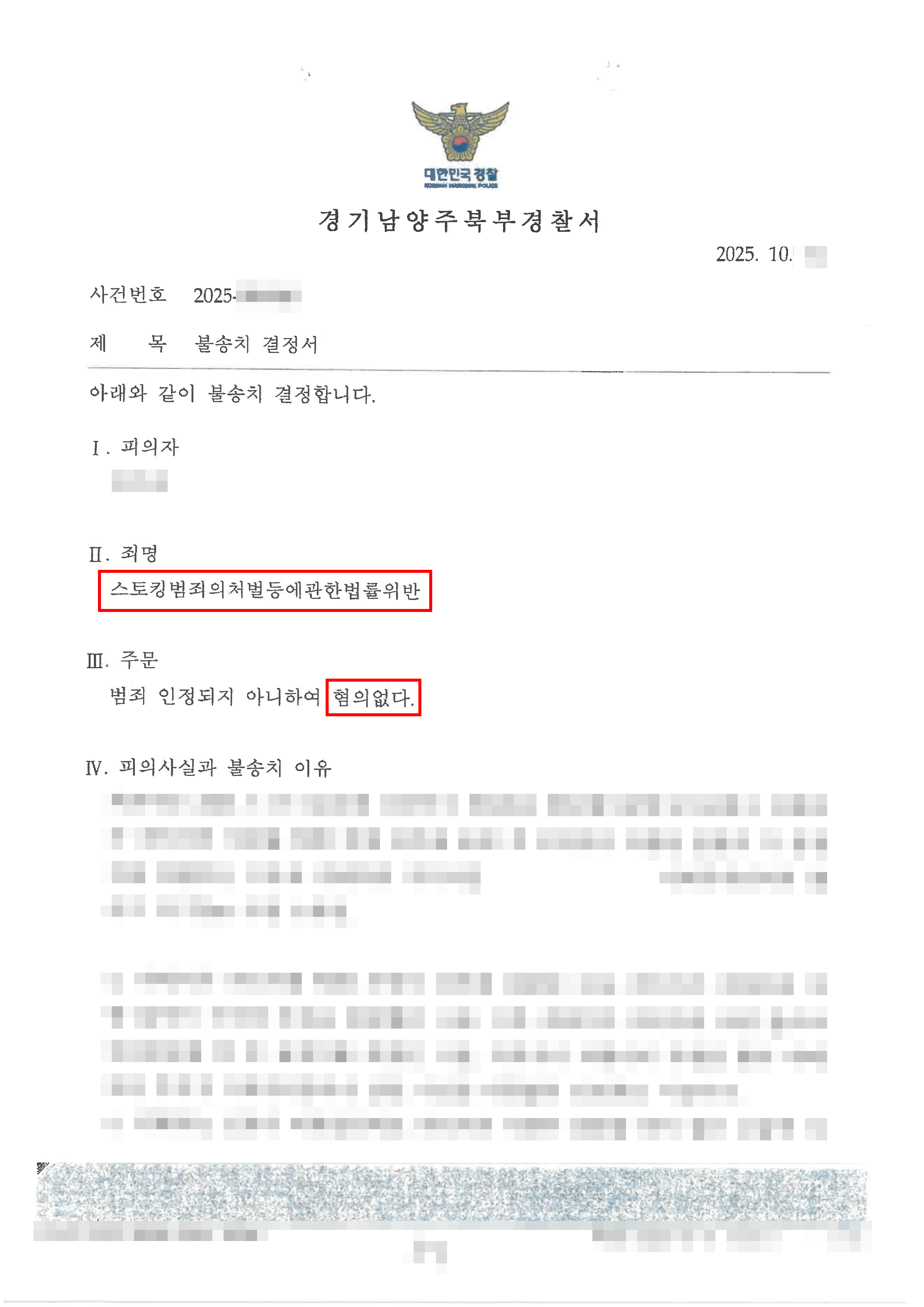남양주형사변호사 결과 | 담당변호사의 법리적 의견이 대부분 받아들여져, 범죄가 인정되지 않아 혐의가 없다는 취지의 불송치결정이 내려졌습니다.