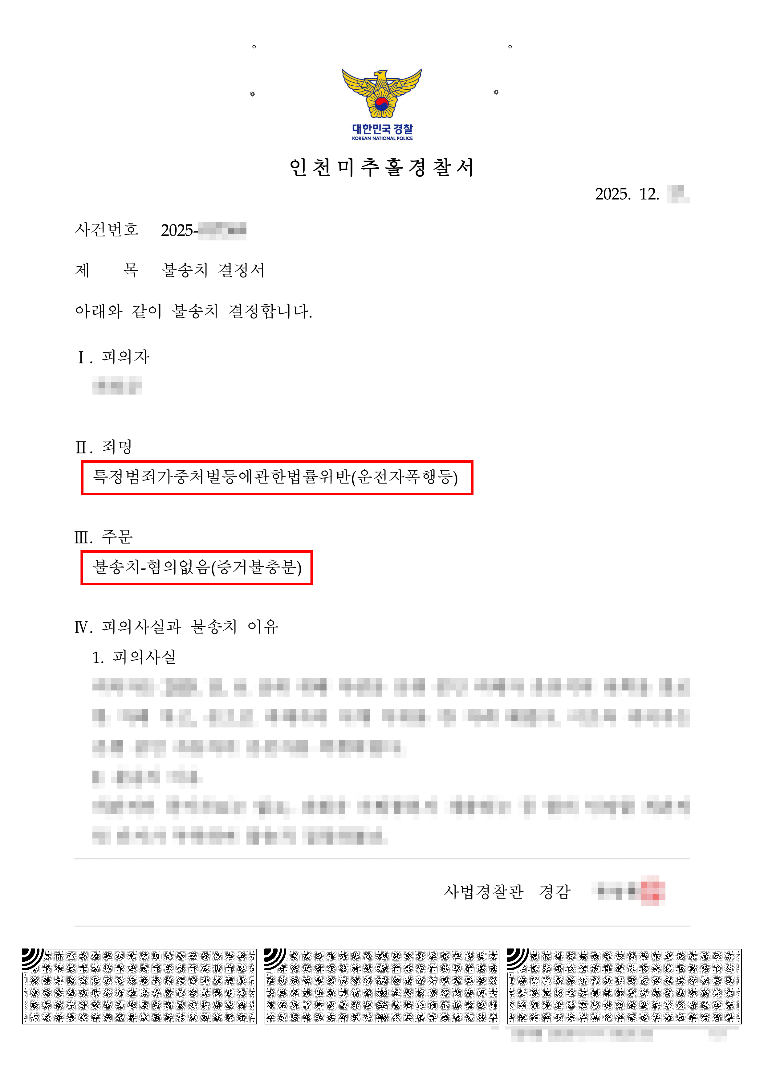 위 불송치 결정으로 의뢰인은 어떠한 형사처벌도 받지 않게 되셨고, 수사가 개시되고 약 2달이 채 지나지 않은 시기에 사건이 종결되어 신속히 평범한 일상으로 돌아가실 수 있었습니다.