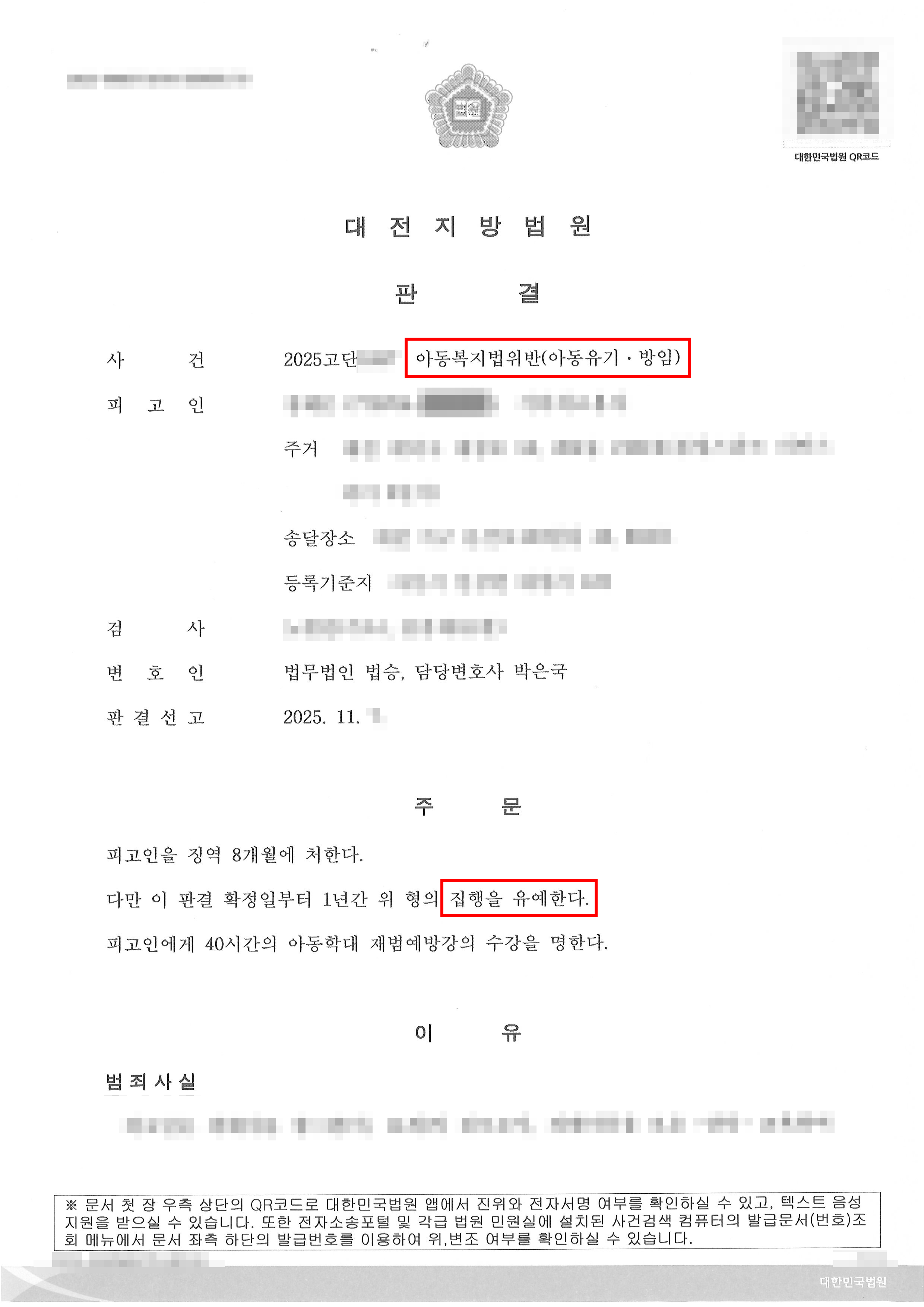 법원은 출생신고가 장기간 이루어지지 않아 공적 교육을 받지 못한 점은 불리한 정상으로 보면서도, 의뢰인이 실질적으로 양육 의무를 이행해 온 점, 현재까지 학대 정황이 확인되지 않는 점 등을 종합적으로 참작하여 집행유예 판결을 선고했습니다.