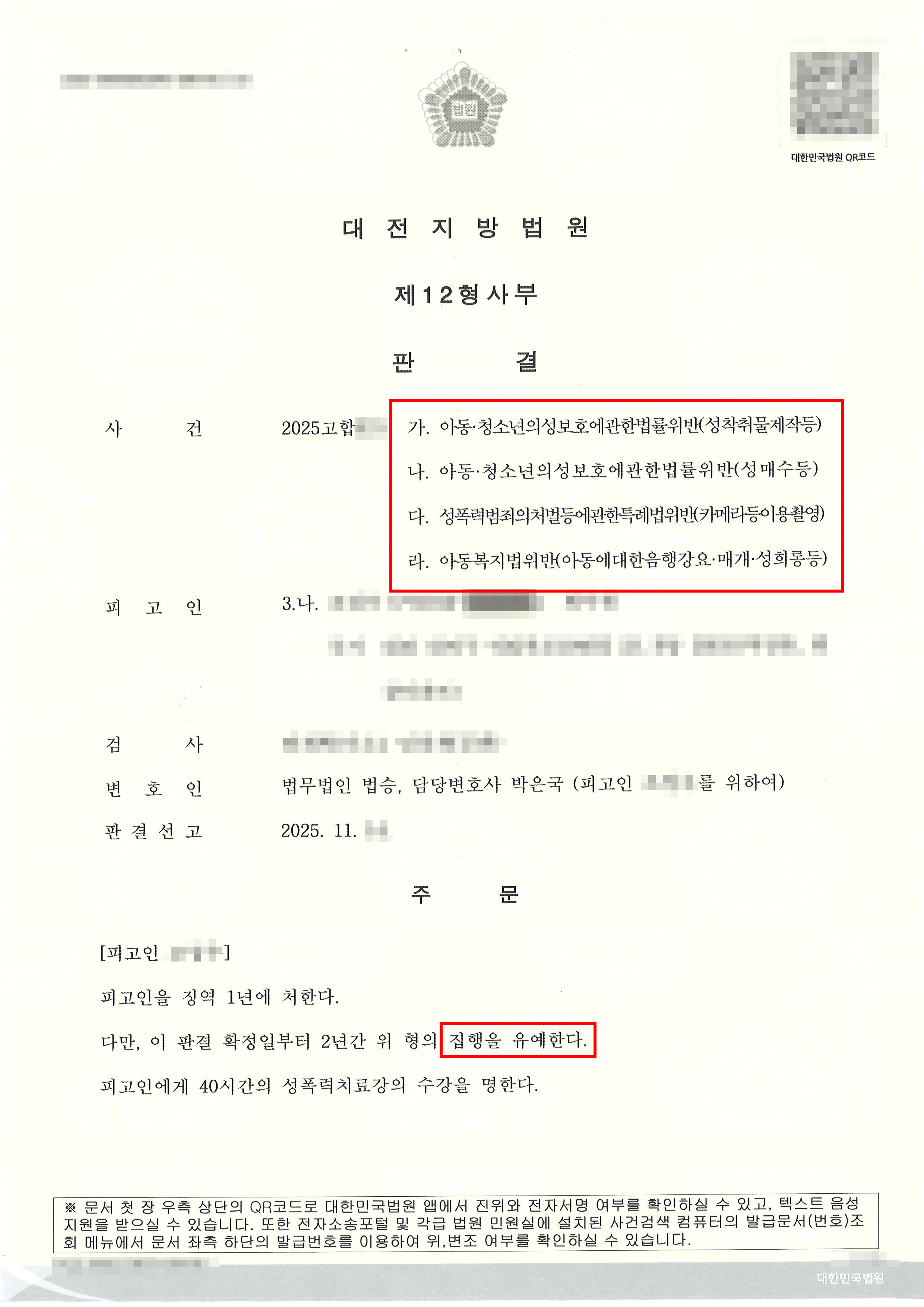 미성년자를 대상으로 한 성범죄는 최근 법원의 처벌 기조가 매우 엄격하며, 특히 이 사건은 동일한 사건군 내 다른 공동 피고인들이 반복적이거나 가학적인 범행을 저지른 부분이 함께 심리된 상황이어서 의뢰인에게까지 높은 형량이 선고될 위험이 존재하였고, 이에 의뢰인은 법적 조력을 받고자 법무법인 법승 대전형사전문변호사를 찾아주셨습니다.