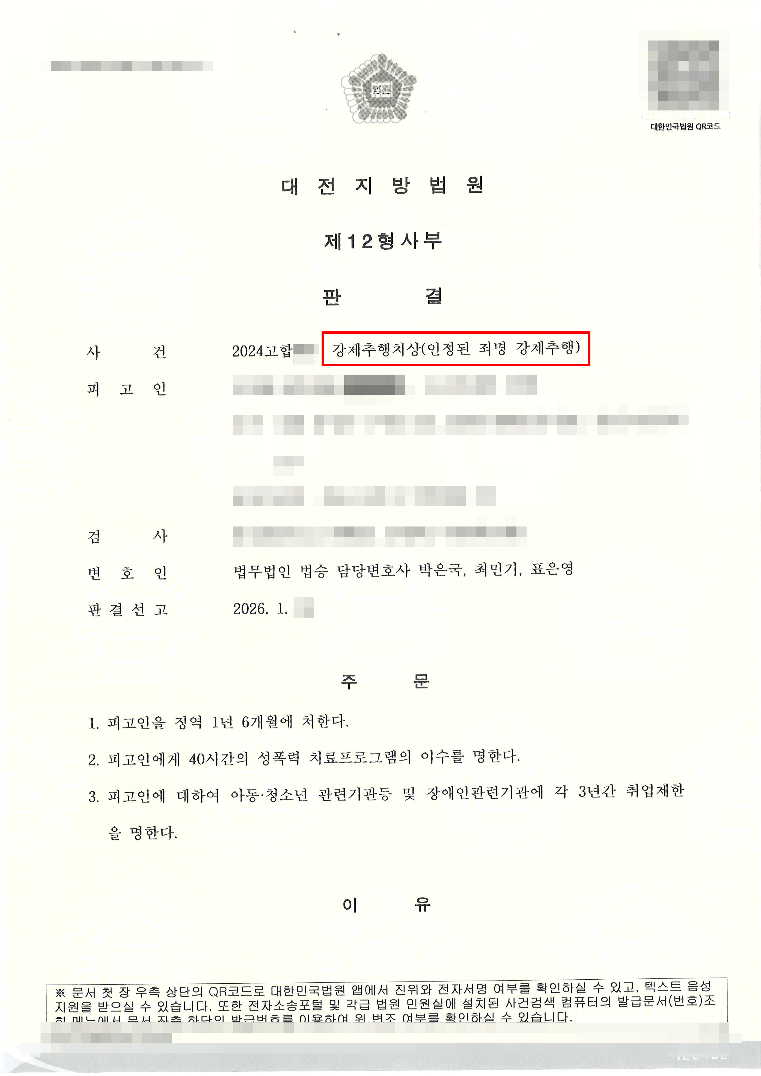 강제추행치상죄는 단순 강제추행과 달리 법정형의 하한이 존재하는 중범죄에 해당하여, 상해가 인정될 경우 실형 가능성이 매우 높은 상황이었습니다. 이에 의뢰인은 중대한 형사책임의 위험 속에서 법무법인 법승 대전형사전문변호사의 법적 조력을 요청하였습니다.