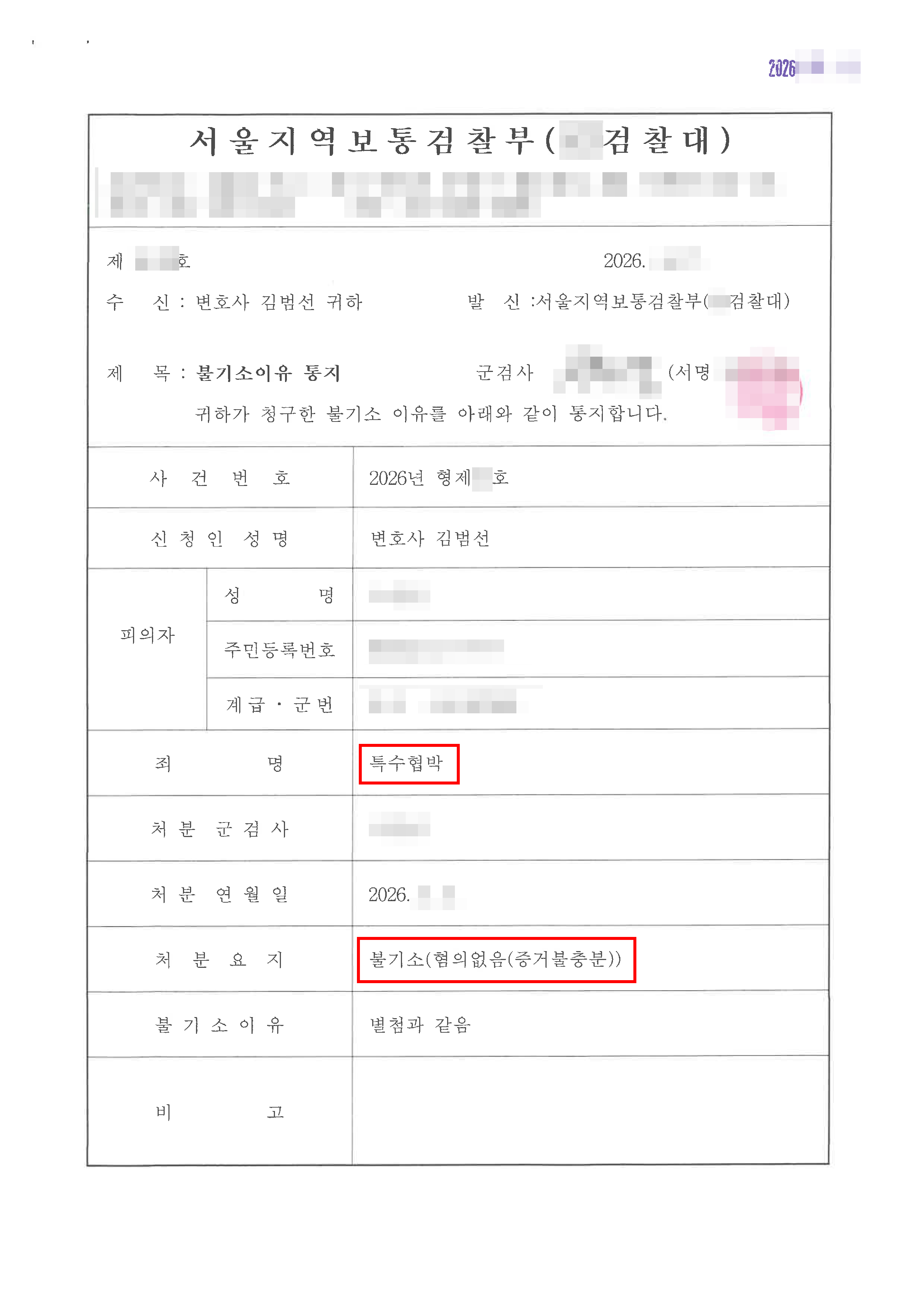 이에 군검찰은 변호인의 주장을 받아들여, 의뢰인의 행위가 사회 통념상 공포심을 일으킬 정도의 해악의 고지에 해당한다고 보기 어렵고, 달리 이를 인정할 증거가 없다고 판단하며, 의뢰인에게 ‘혐의없음(증거불충분)’으로 불기소 처분을 하였습니다.