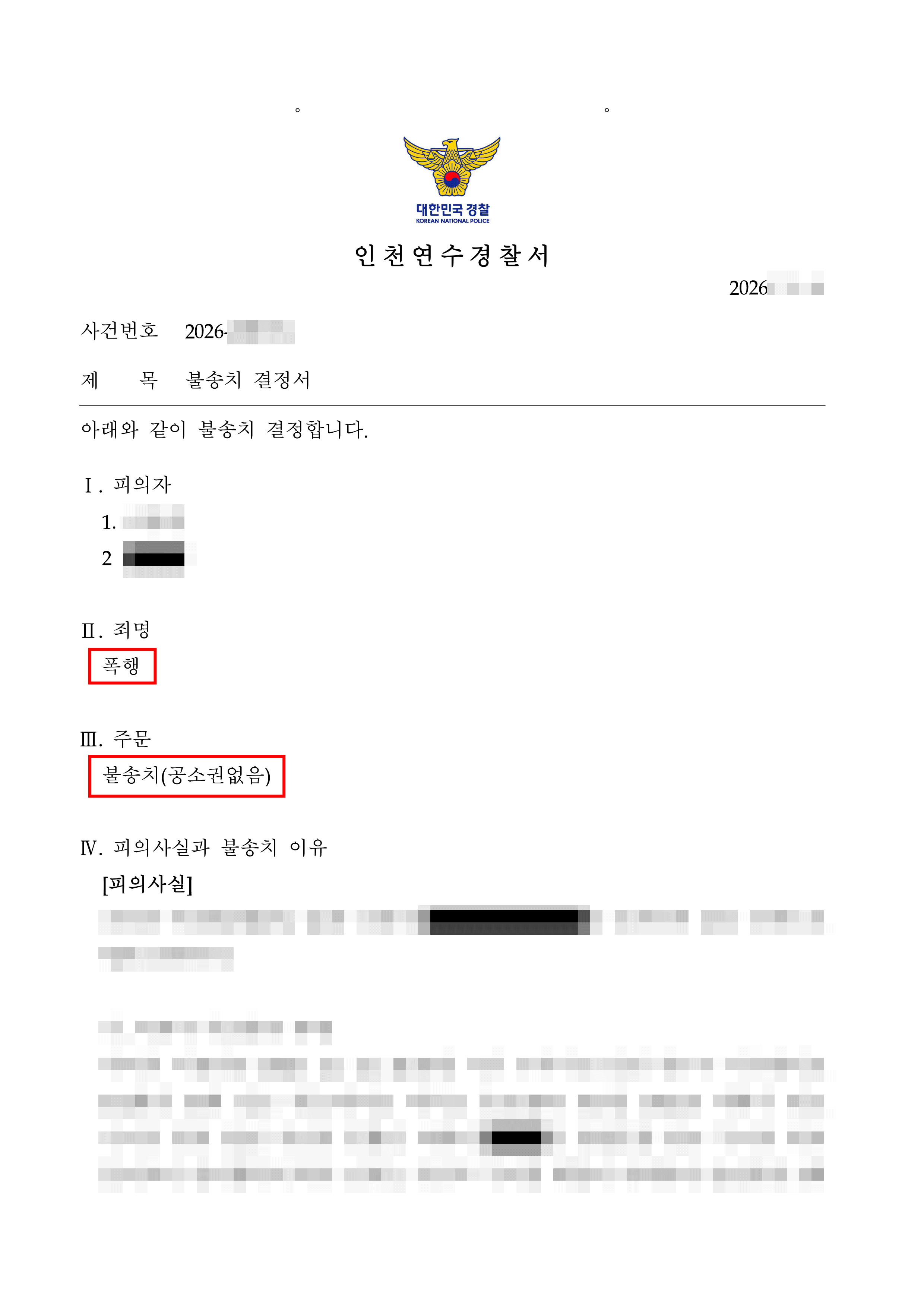 이에 수사기관은 양측이 합의하고 처벌을 원하지 않는다는 것을 확인하고 “불송치(공소권없음)” 결정을 내렸습니다.