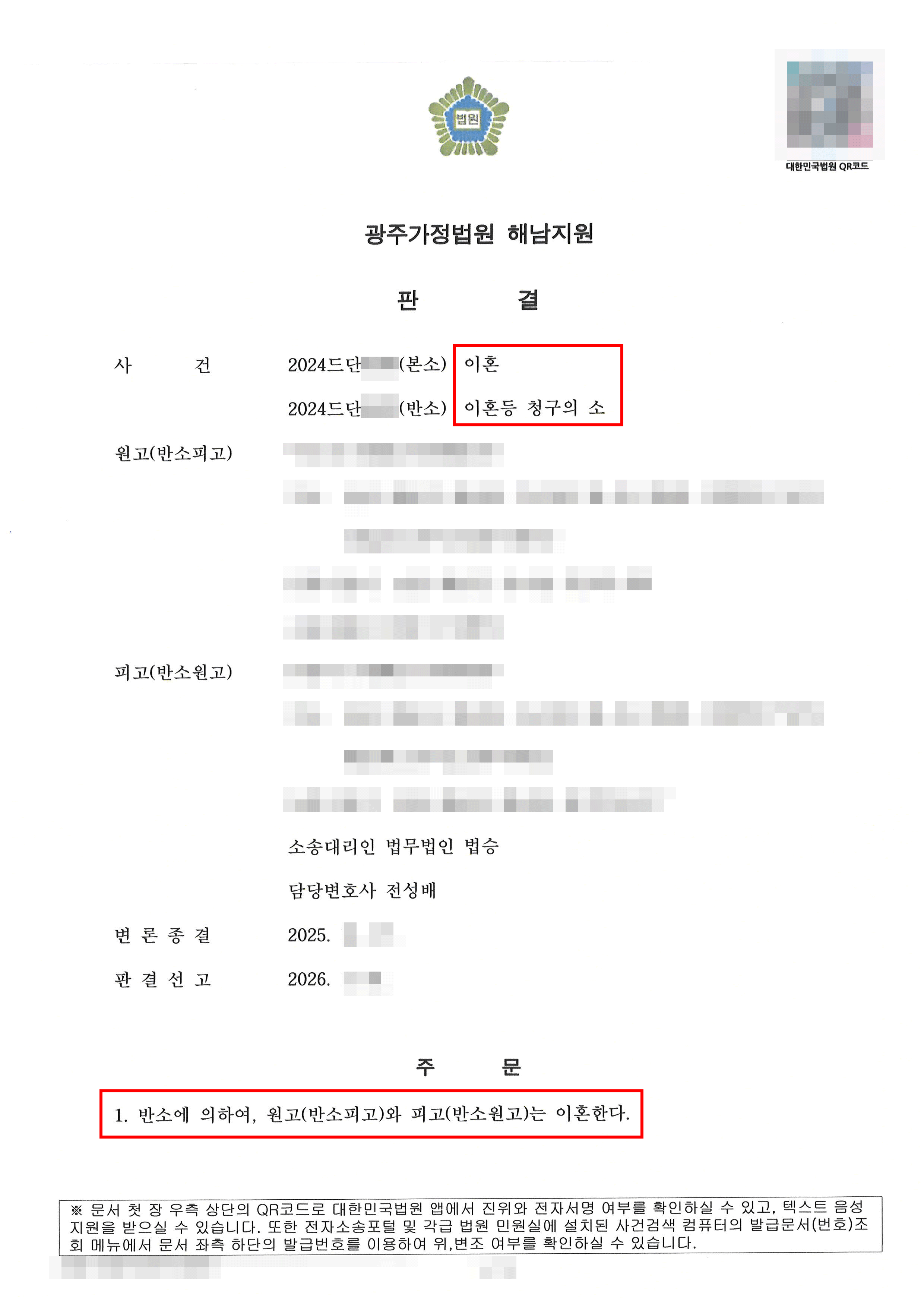 이혼 소송은 감정의 대립을 넘어, 사실관계와 증명 책임의 문제입니다. 이번 사례는 과학적 자료와 체계적인 법리 정리를 통해 의뢰인의 명예와 재산권을 모두 지켜낸 의미 있는 사례라 할 수 있습니다.