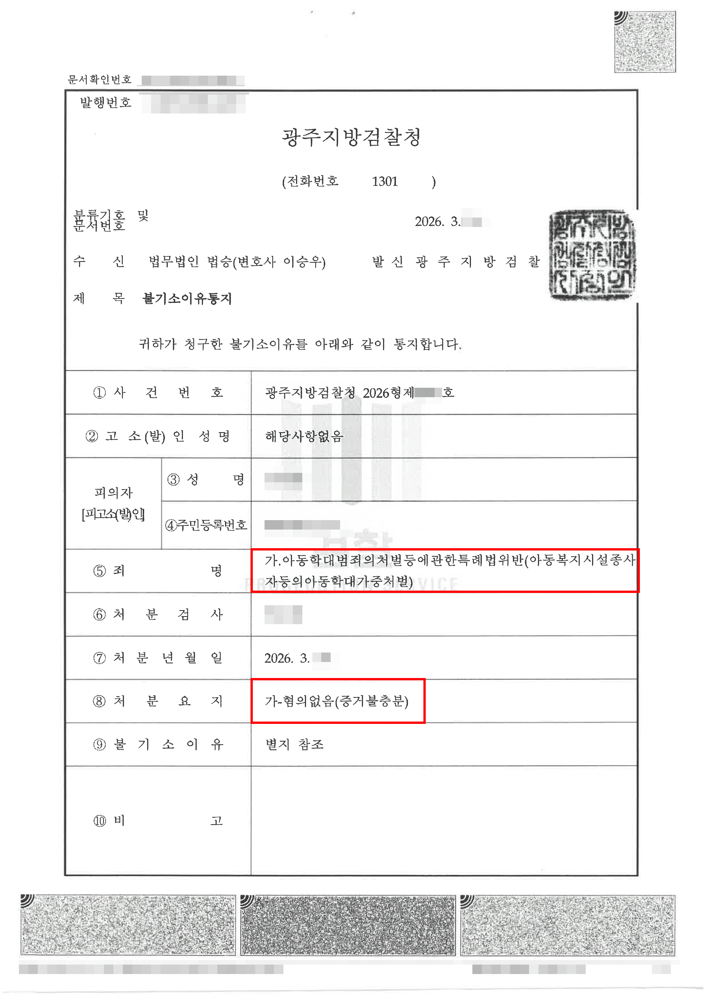 이에 광주지방검찰청은 변호인의 주장을 받아들여, '혐의없음(증거불충분)'으로 불기소 처분을 내렸습니다.