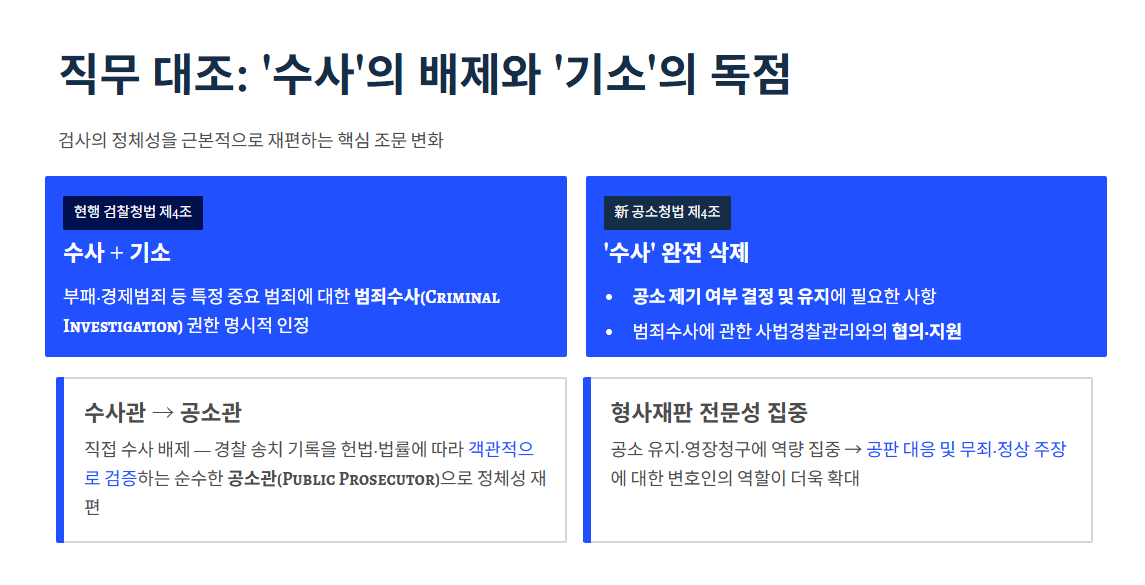 그러나 새롭게 제정될 「공소청법」 제4조는 검사의 직무에서 이 '수사'라는 단어를 완전히 삭제했습니다.