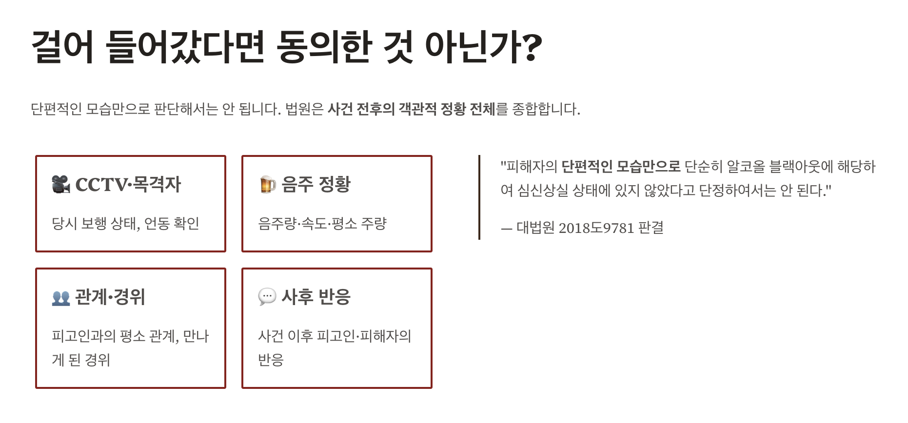이처럼 우리 법원은 단순히 걷는 모습만 보는 것이 아니라, CCTV 영상에 나타난 보행 상태, 당시 음주량과 음주 속도, 피해자의 평소 주량, 피고인과의 평소 관계와 만나게 된 경위, 사건 직전후의 언동 등 수많은 객관적 증거를 퍼즐처럼 맞추어 당시 피해자의 진짜 상태를 과학적으로 복원합니다.